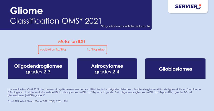 La classification OMS 2021 des tumeurs du système nerveux central définit les trois catégories distinctes suivantes de gliomes diffus chez l’adulte en fonction des éventuelles mutations identifiées.
